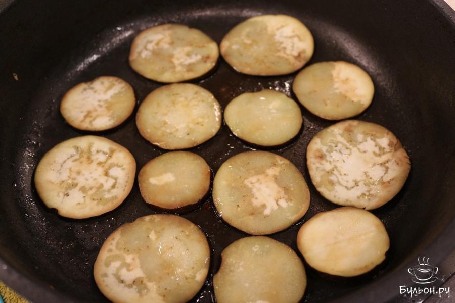 2. На раскаленную сковороду наливаем растительное масло, после выкладываем на нее баклажаны и обжариваем их с 2 сторон до образования золотистой корочки.
