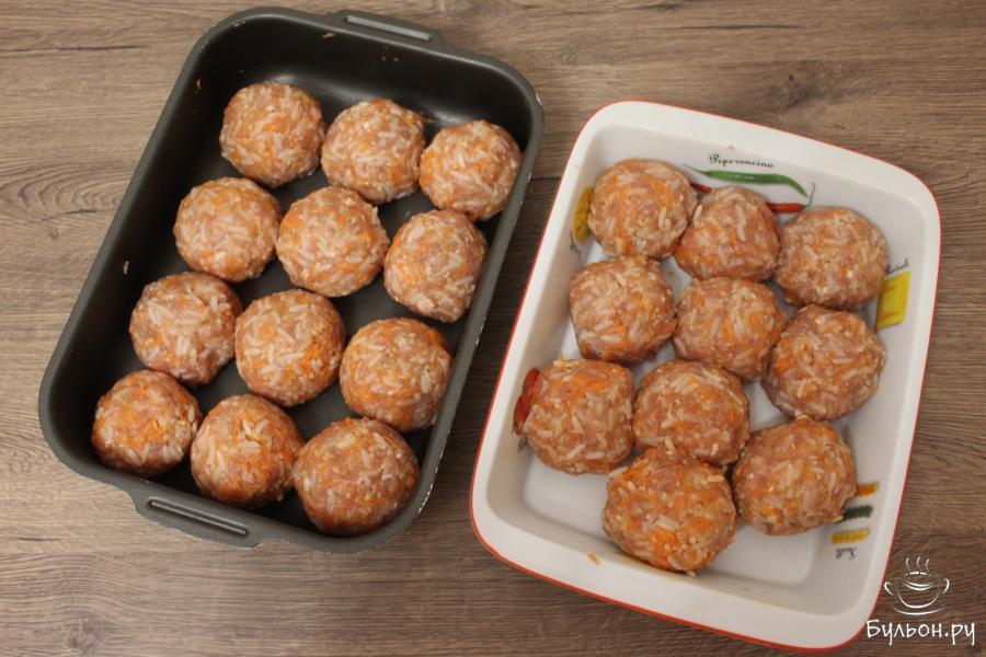 5. Из получившейся массы сформировать мясные шарики и выложить в формы для запекания. Размер мясных шариков может быть любой. У меня из данного количества ингредиентов получилось 22 хороших ежика.