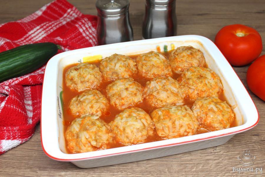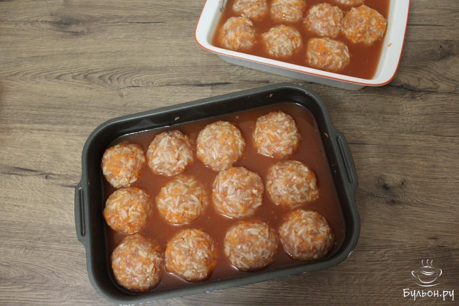 7. Залейте мясные ежики томатным соусом, формы накройте фольгой и поставьте в разогретую до 180 градусов духовку примерно на 50 минут.
