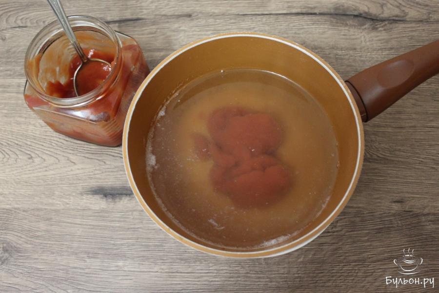 6. Бульон подогреть и в нем развести томатную пасту. У меня был мясной бульон, вы можете использовать овощной. Если же бульона нет вовсе и варить его не хочется, просто замените бульон обычной водой.