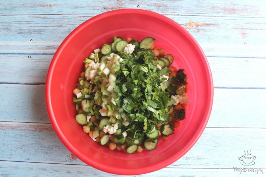 5. Лук и кинзу промоем, обсушим и мелко нарежем. Зелень можно добавить совершенно любую, которую вы любите.