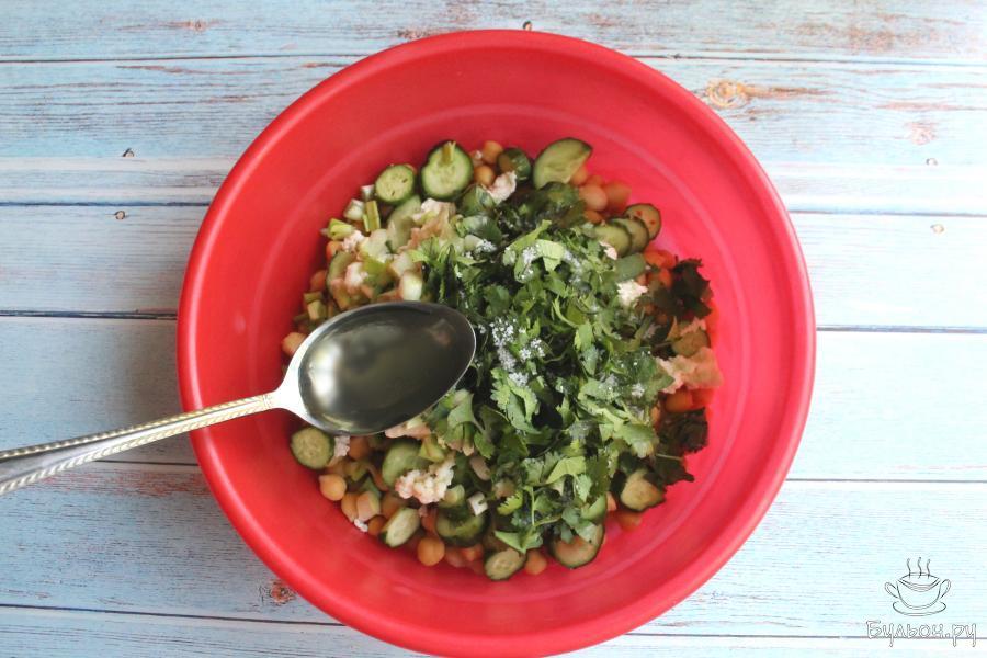 6. Добавим в салат масло и если нужно соль. Если брынза соленая, то может соль и не понадобится. По желанию в салат можно добавить лимонный сок.