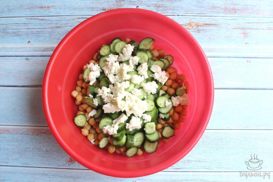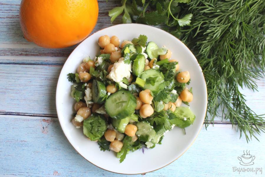 Салат с нутом, брынзой и огурцами легкий, но и одновременно сытный салат. Порцией такого салат вполне можно заменить порцию обеда или ужина. Салат получается насыщенный, сочный, ароматный, вкусный и нежный. Нут для салата желательно замочить заранее в ночь, тогда на следующий день салат приготовится достаточно быстро. Такой салат можно дополнить своей любимой душистой зеленью, заправить салат ароматным оливковым или другим растительным маслом.