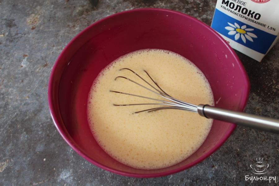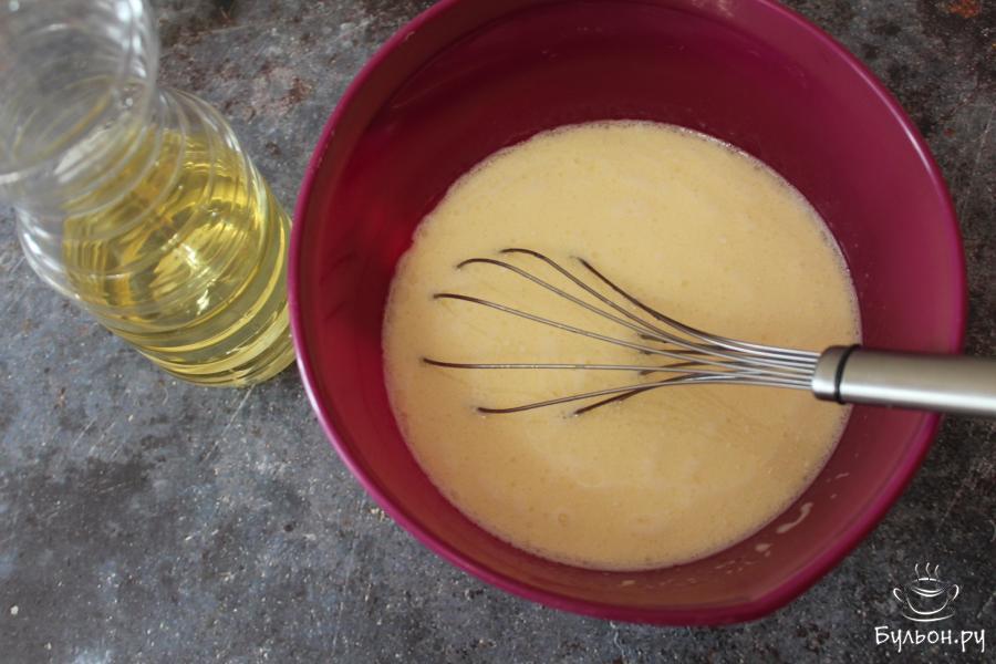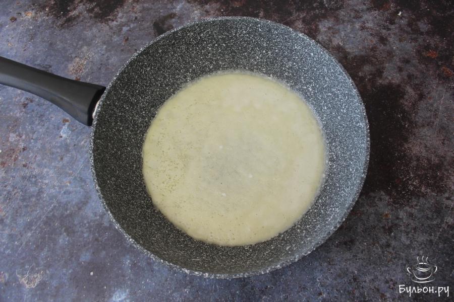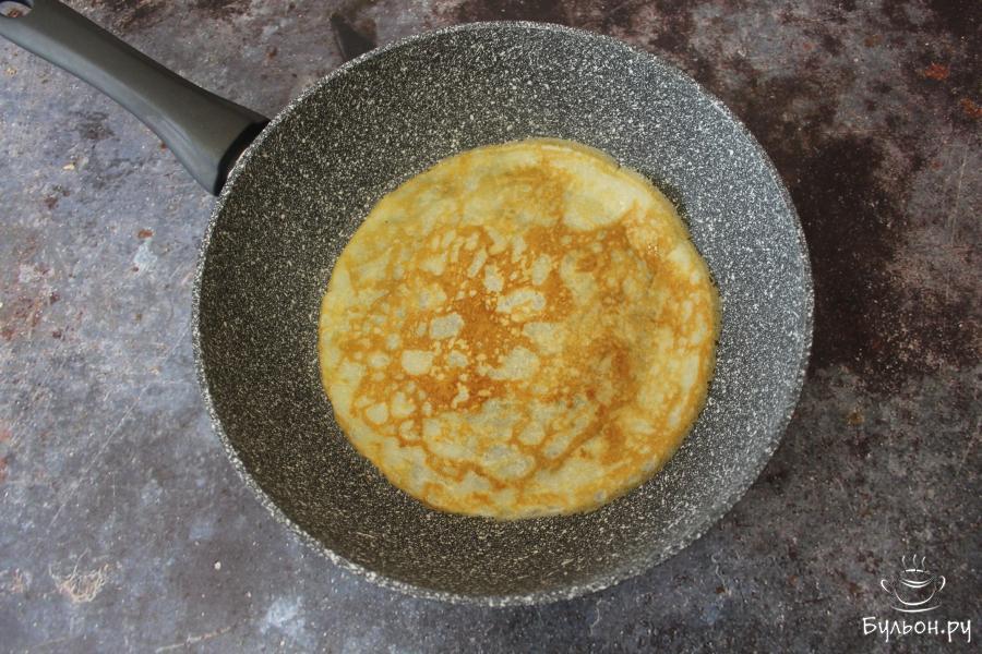 6. На сковородку диаметром 18-20 см., смазанную рафинированным маслом, вольем тесто, примерно половину половника, и поможем круговыми движениями растечься ему в большой круг. Обжарим блин с одной стороны на среднем огне около 1-2 минут.