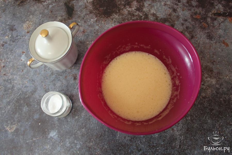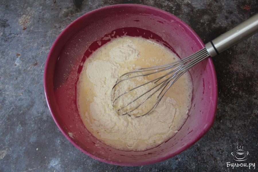 3. Следом добавим просеянный через сито картофельный крахмал и перемешаем. Венчиком вымешивать будет очень тяжело, поэтому лучше воспользоваться ложкой.