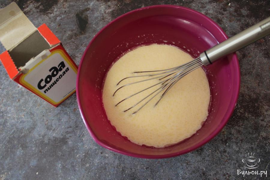 5. И соду, гашеную 9%-ым уксусом. Количество уксуса определяется следующим образом. Понемногу уксус вливается на ложку с содой, и когда сода будет полностью погашена, тогда и перестаем вливать уксус на ложку. Перемешаем.