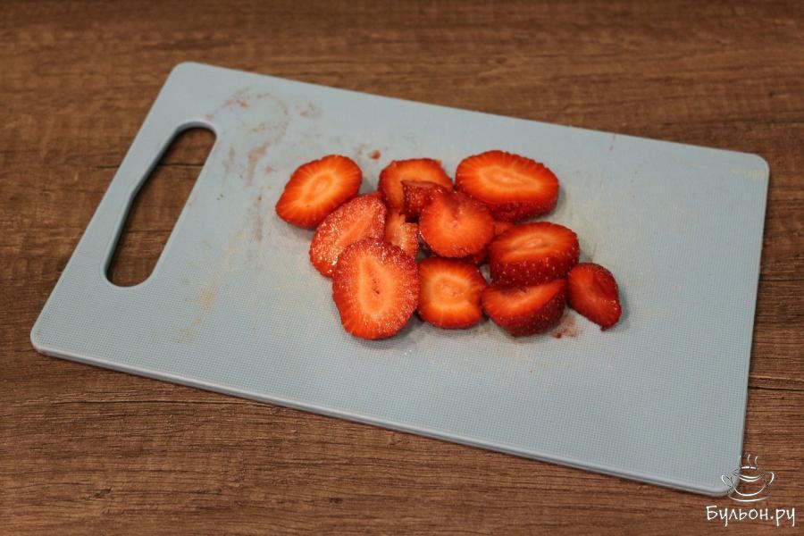 4. Ломаное печенье кладем в прозрачную емкость - стакан или креманку. Поливаем ромом. Далее на клубнику выкладываем сметану, смешанную с сахаром.