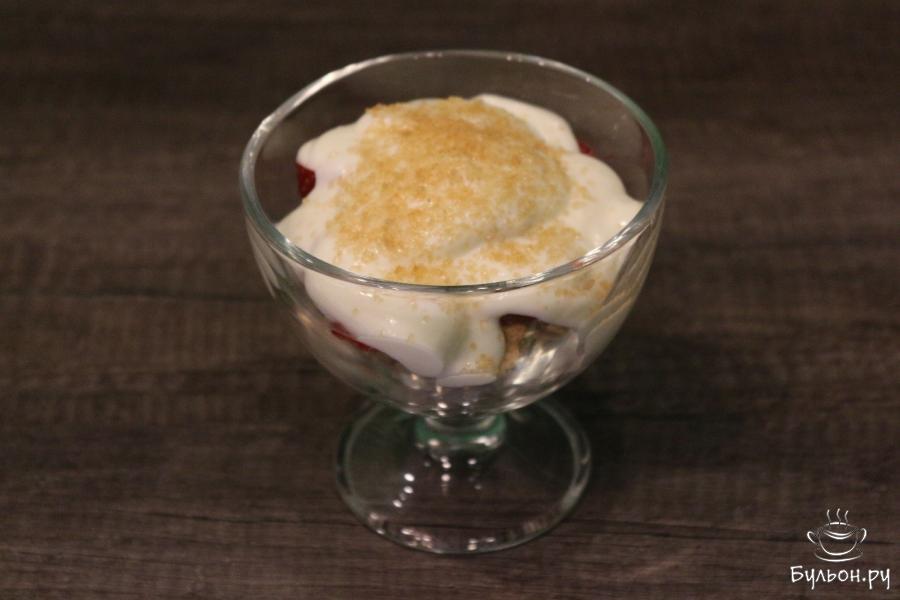 Приготовьте очень эффектный по красоте английский десерт из печенья, клубники и сметаны. Такой десерт называется трайфл. Но приготовлен он не совсем по классическому рецепту, а по немного упрощенному варианту. Получается десерт сладеньким, красочным, вкусным и быстрым в приготовлении. По аналогии с этим рецептом можно приготовить похожие, но на свой вкус. Смело можете вместо печенья использовать бисквит, а вместо клубники, любую другую ягоду или фрукт.