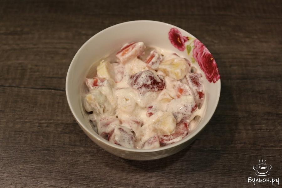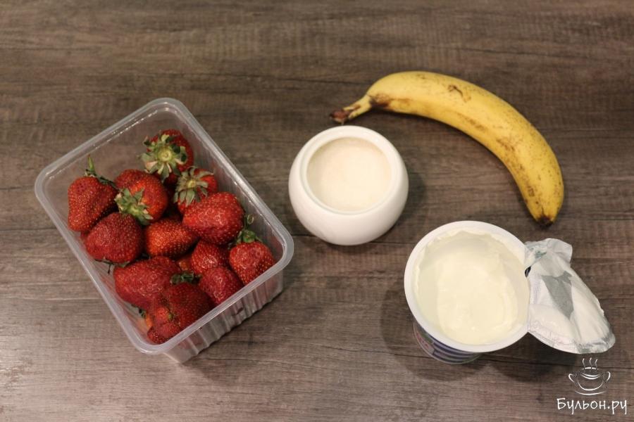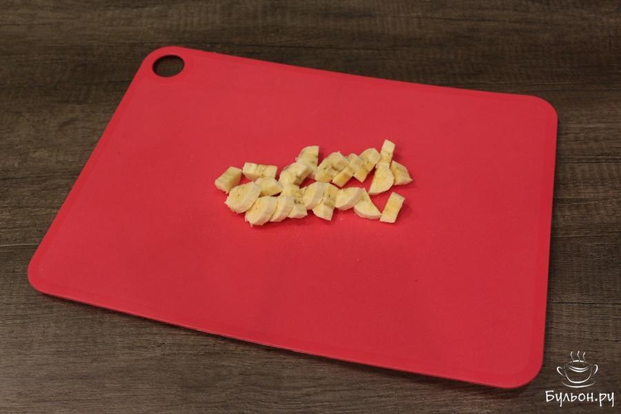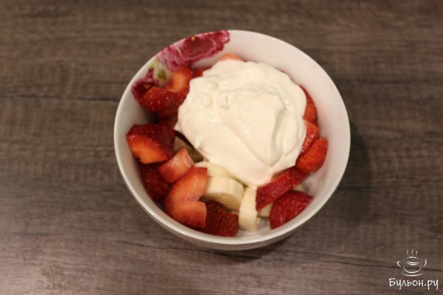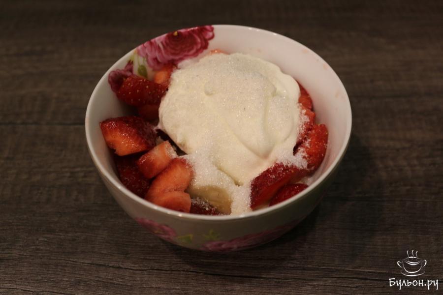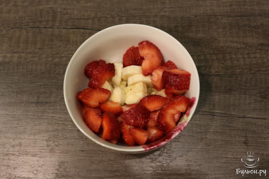 3. Клубнику моем, вытираем, и нарезаем так же, как и банан, средними кусочками. Добавляем ее к банану.
