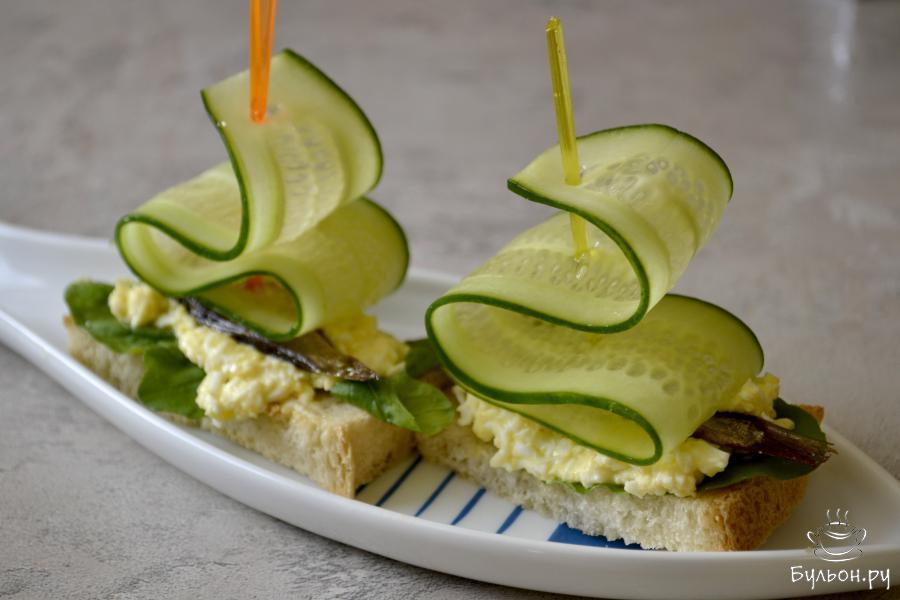 11. Закуска из шпрот, свежего огурца и яйца, на подсушенном хлебе, готова. Быстро, просто и вкусно. Приятного аппетита!