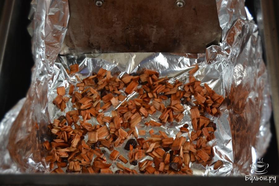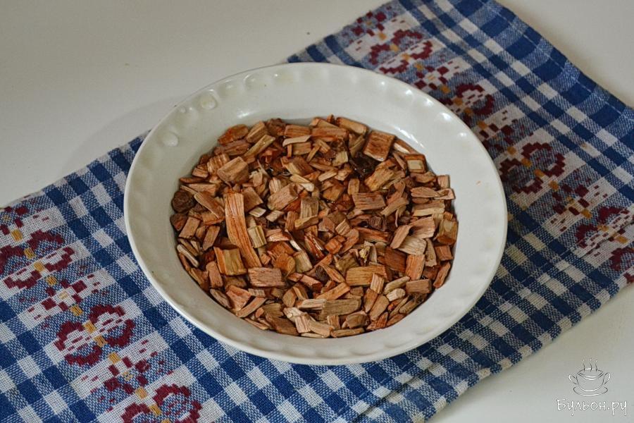 2. Щепу для копчения намочить. Нам понадобится щепа плодовых деревьев - яблони, вишни, груши, абрикоса. Хорошо подходит также щепа ольхи, можно использовать опилки бука, дуба или микс щепы вышеперечисленных деревьев.