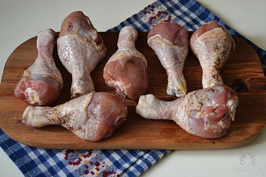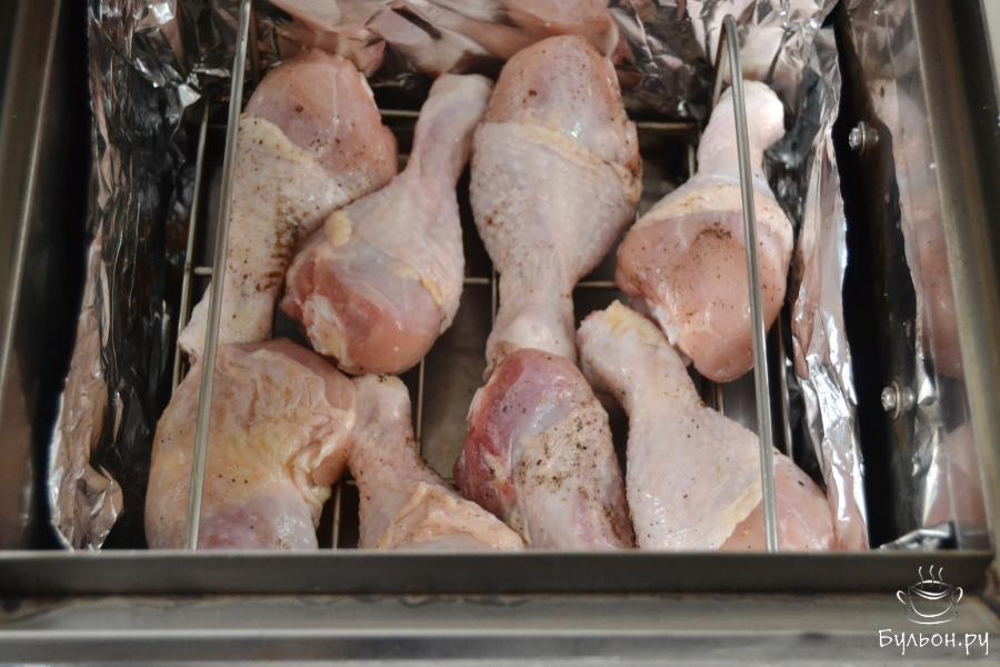 1. Куриные голени перед копчением необходимо засолить на 5 часов. Количество соли примерно такое же, как для жарки. Обсыпать ножки черным молотым перчиком, приправой для курицы, выдавить немного чеснока по вкусу.