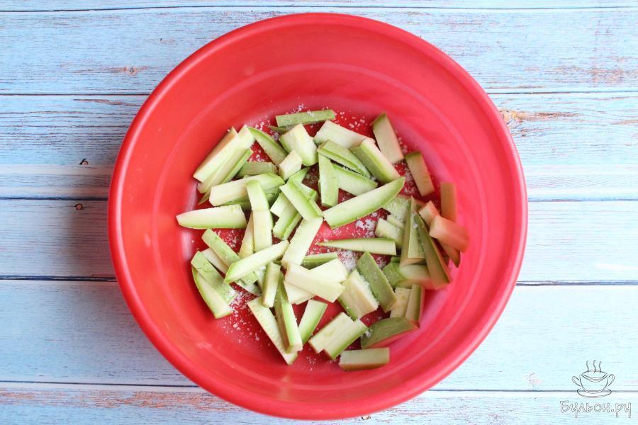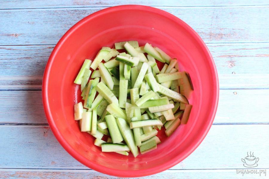 1. Крупный кабачок промоем, нарежем не очень толстыми брусочками и посыпем кабачок солью, перемешаем. Оставим кабачок постоять минут 15. Если кожица у кабачка грубая, то можно его почистить.