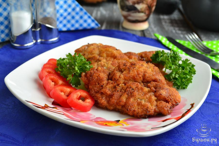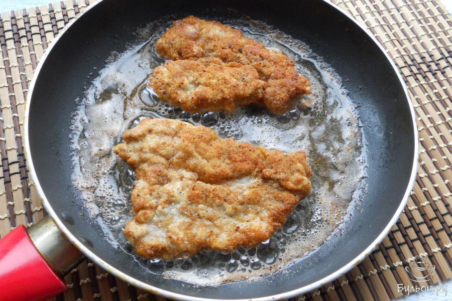 9. Жарить шницели в масле по 2 минуты с каждой стороны на среднем или довольно сильном огне. Панировка должна стать волнистой и красивого золотистого цвета.
