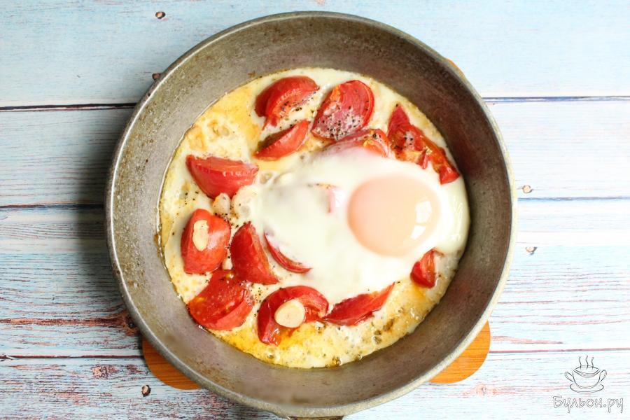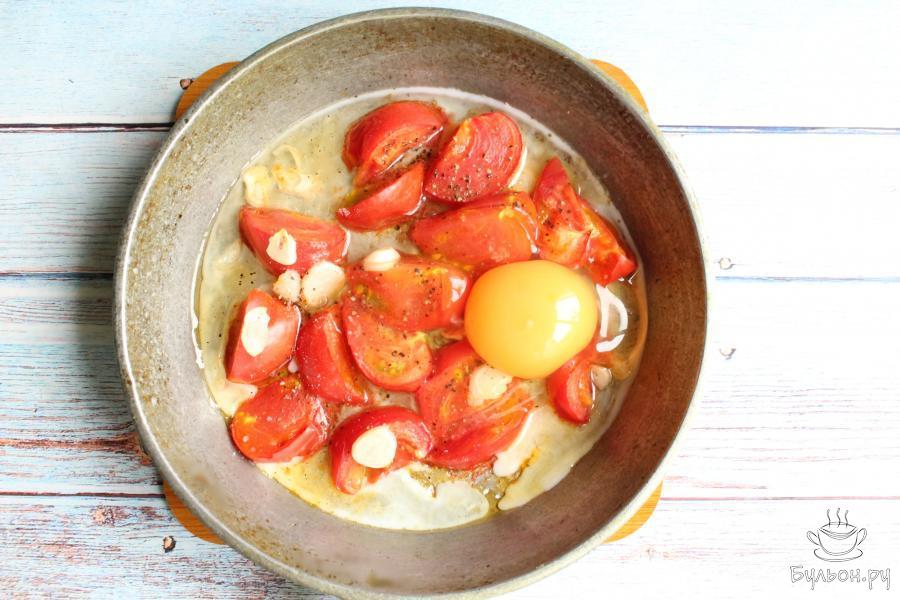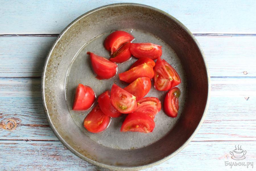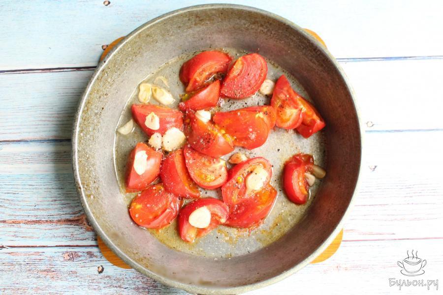 2. Чеснок почистим, нарежем его не очень мелко и добавим к помидорам. Добавим на сковороду масло. Отправим помидоры в духовку, разогретую до 180 градусов, на 10-15 минут.