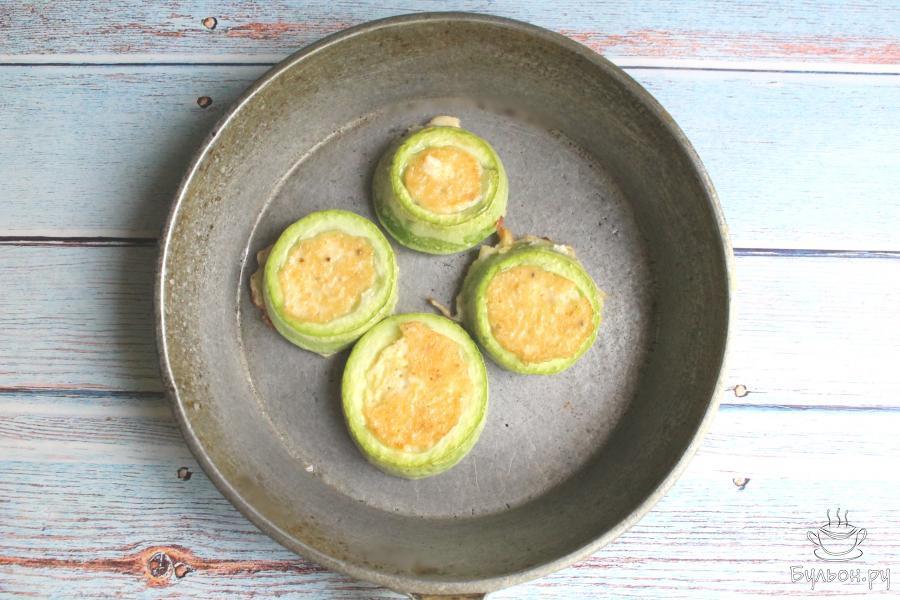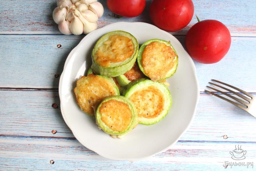 6. На сковороде разогреваем масло. Выкладываем кабачковые кольца, в каждое кольцо выкладываем тесто. Жарим оладьи по несколько минут с каждой стороны.