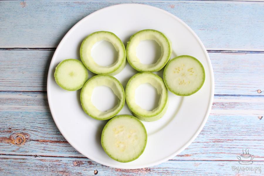 1. Кабачок промоем, нарежем его не очень тонкими кружочками. Аккуратно вырежем в кружочках серединки, чтобы у нас получились кольца.