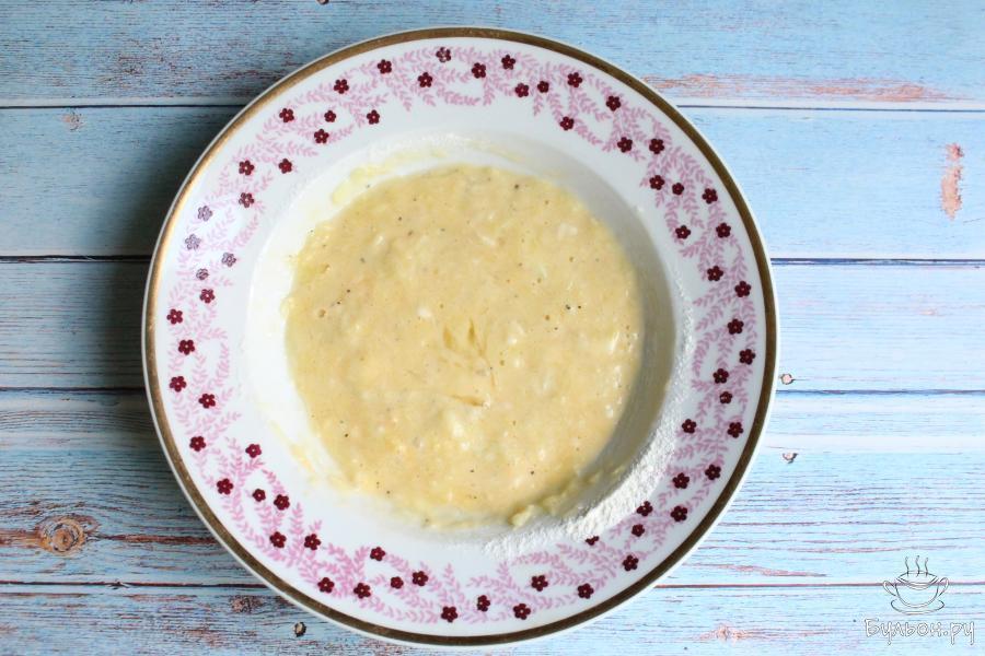 4. Добавляем к кабачковой мякоти муку и перемешиваем. Муки может уйти немного больше, это зависит от сочности кабачка.