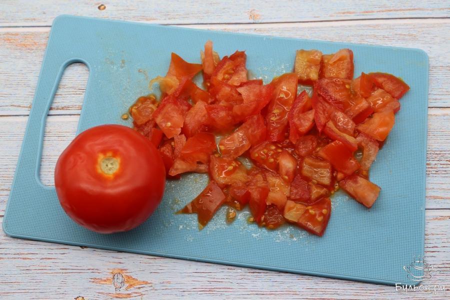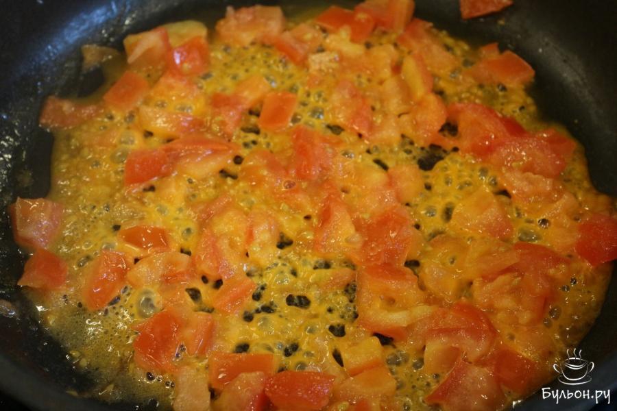 3. Как только сковорода нагрелась, а масло растаяло, выкладываем на сковороду помидоры, порезанные на кубики.