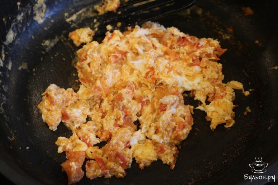 5. Затем в сковороду вбиваем яйца, добавляем соль и перемешиваем все вместе, то есть взбалтываем. Жарим еще 1-2 минуты, постоянно помешивая яйца с помидорами.