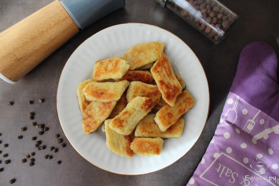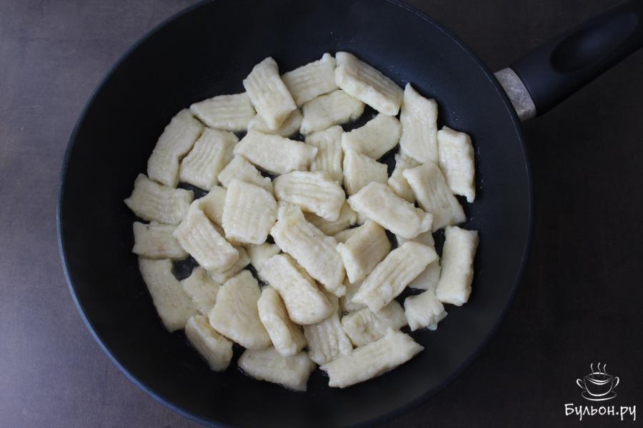 7. Ньокки откинем на друшлаг, дадим стечь воде и сразу же переложим на сковороду с разогретым рафинированным маслом. Обжарим со всех сторон.