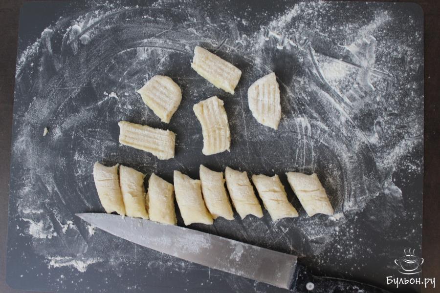 5. 1/3 теста раскатаем в колбаску и нарежем, как ленивые вареники. Вилкой сверху слегка придавим для образования легкого рисунка. С оставшимся тестом поступим также.