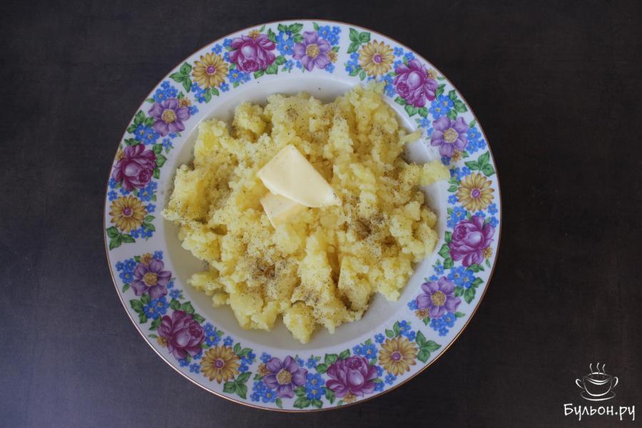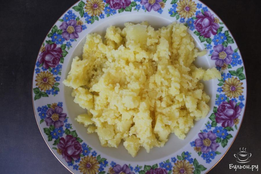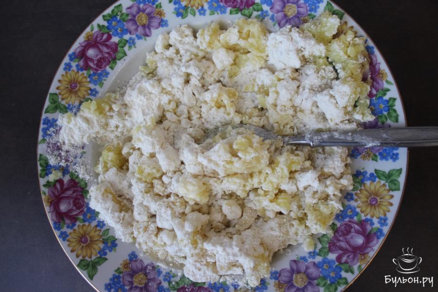 4. Подсыпая понемногу просеянную муку, замесим картофельное тесто. Оно должно схватиться в один шар.