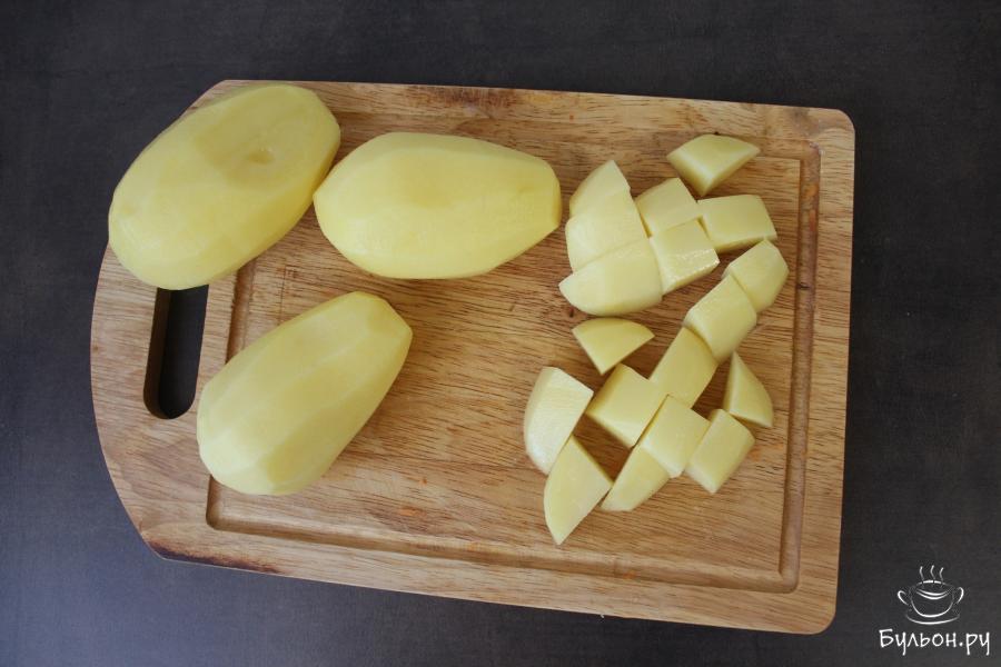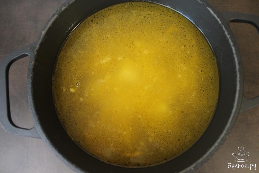 7. Готовый бульон процеживаем сразу же в казан, в котором обжаривались морковь с луком и всыпаем картофель. Доводим суп до кипения и варим 10 минут.