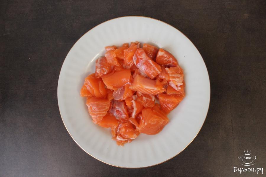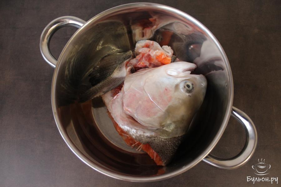 1. Суповой набор очищаем от чешуи, хорошо промываем, со стейка снимаем рыбное мясо, с головы удаляем жабры, глаза и плавники. Все, кроме филе, кладем в кастрюлю, заливаем водой и варим 20 минут после закипания, не забыв снять пенку.