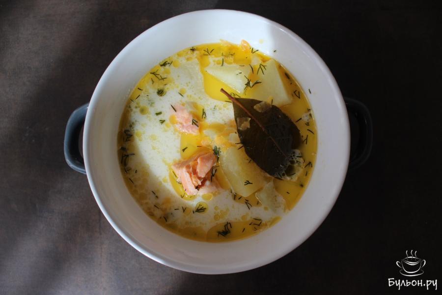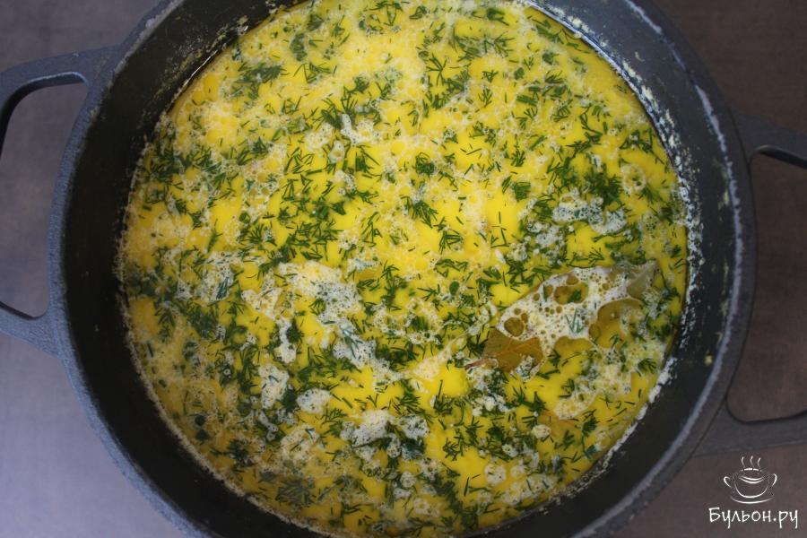 9. В последний момент всыпаем перец горошком, кладем лавровые листики, солим, добавляем по вкусу мелко нарезанный укроп и вливаем сливки, у меня 20% жирности. Даем супу прокипеть в течение 2-х минут. После чего снимаем с огня и даем супу напитаться ароматами.