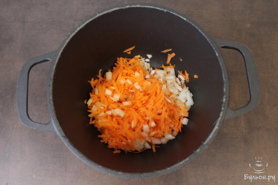 5. Овощи перекладываем в казан или кастрюлю с антипригарным дном, добавляем масло и слегка обжариваем до мягкости.