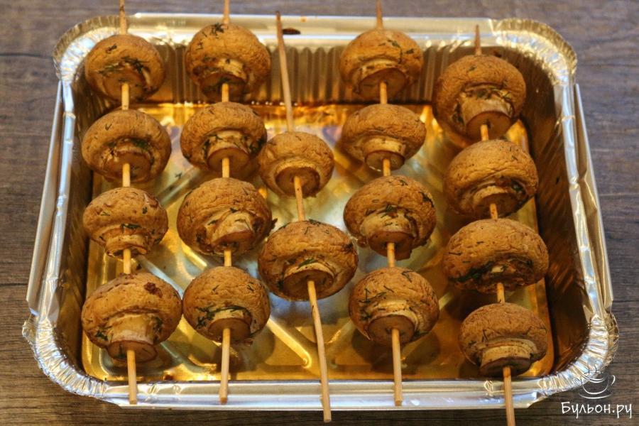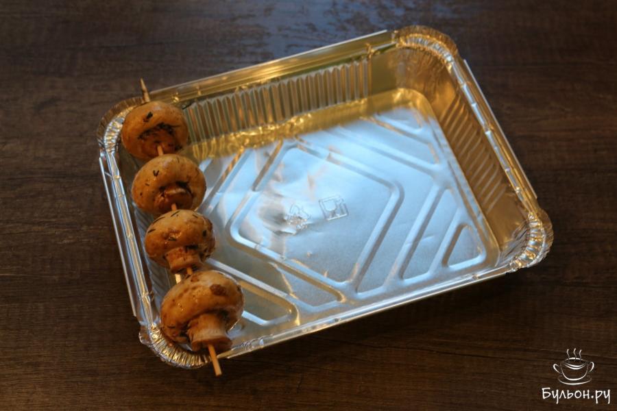 5. Затем грибы нанизываем на шпажки и устанавливаем их в форму так, чтобы грибы находились в воздухе.