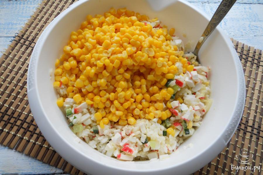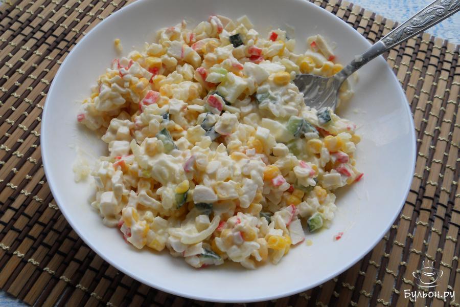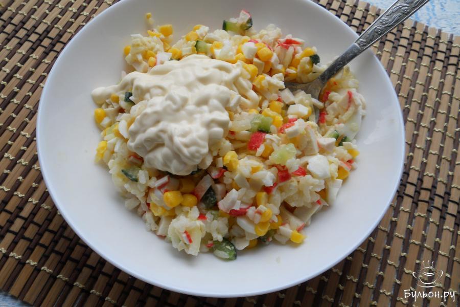 6. Если салат использовать не сразу - часть его отложить в тарелку, добавить майонез и соль по вкусу. Оставшийся салат поместить в холодильник.