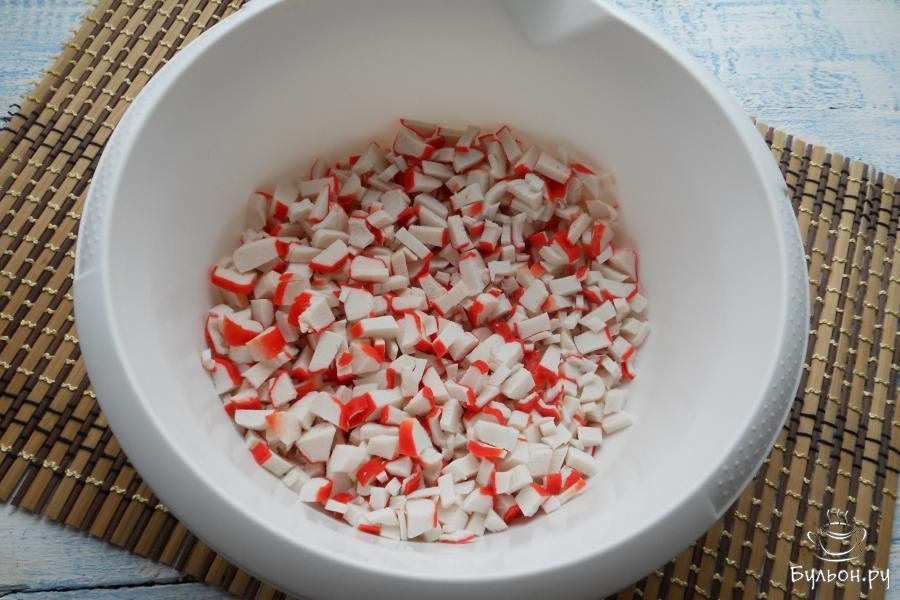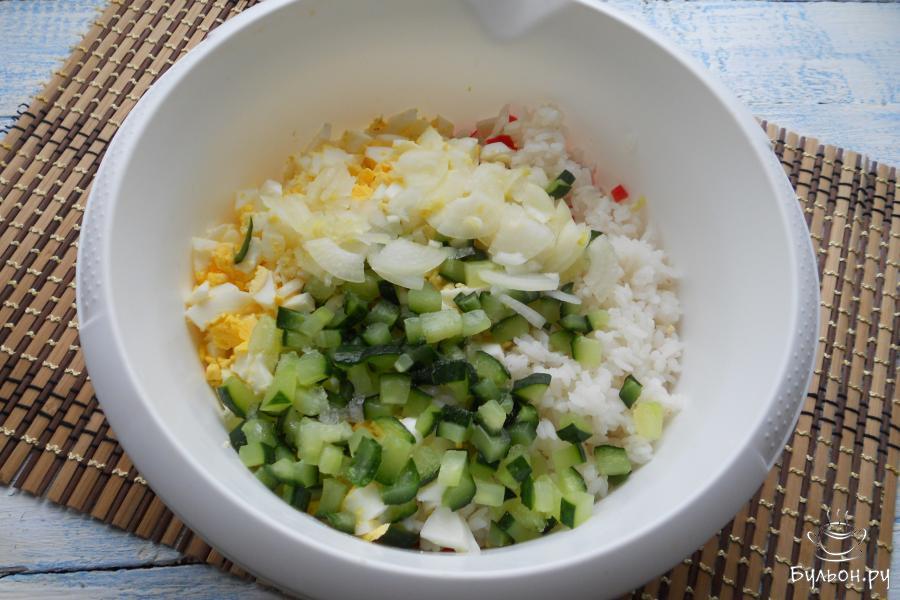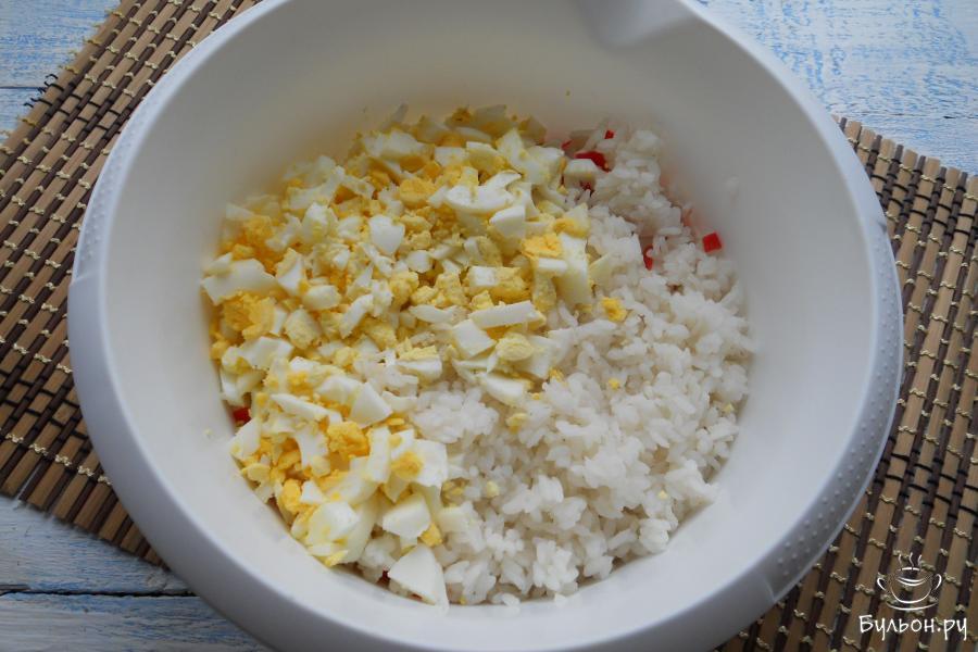 2. Рис залить водой в соотношении 1:2 и варить около 15 минут, рис не должен быть переваренным. Далее рис промыть под холодной водой. Яйца отварить, остудить и очистить. Добавить к крабовым палочкам рис и рубленные вареные яйца.