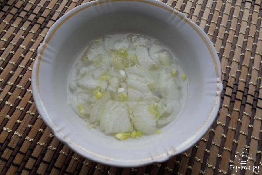 3. Небольшой лук порезать тонкими четвертинами и залить на 15 минут кипятком, после чего воду слить, лук отжать.