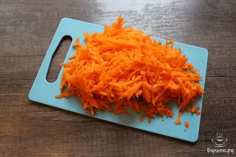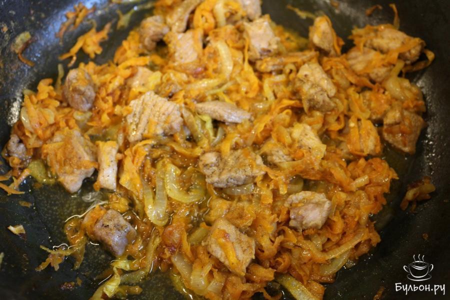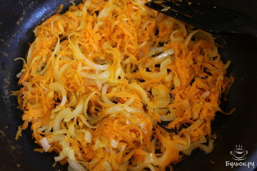 5. Лук и морковь жарим вместе на сковороде, на растительном масле. Овощи обжариваем только до мягкости, периодически помешиваем.
