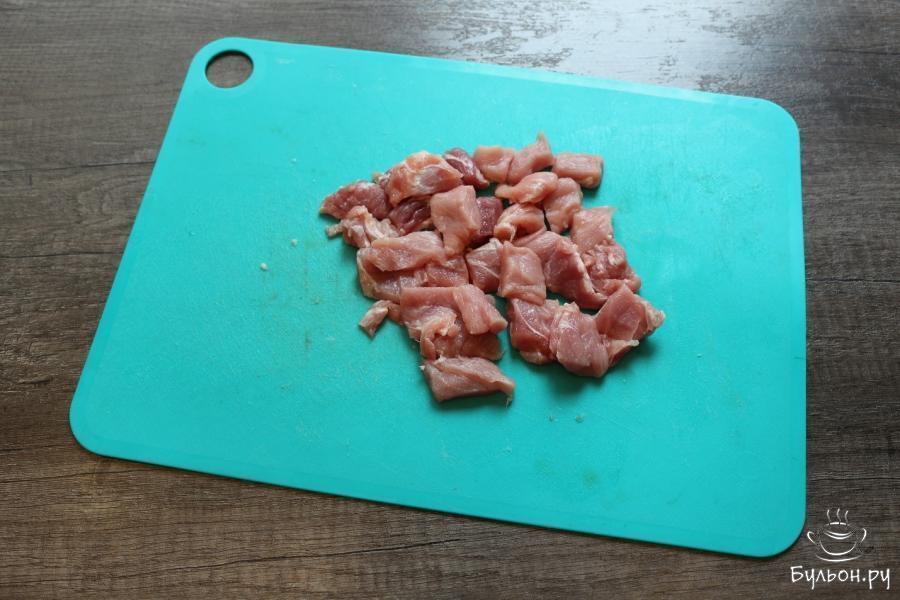 1. Берем свинину и моем ее под проточной водой. После убираем лишнюю воду бумажными полотенцами и режем мясо на куски. Кусочки будут среднего размера, но не толстыми, примерно как на фото.
