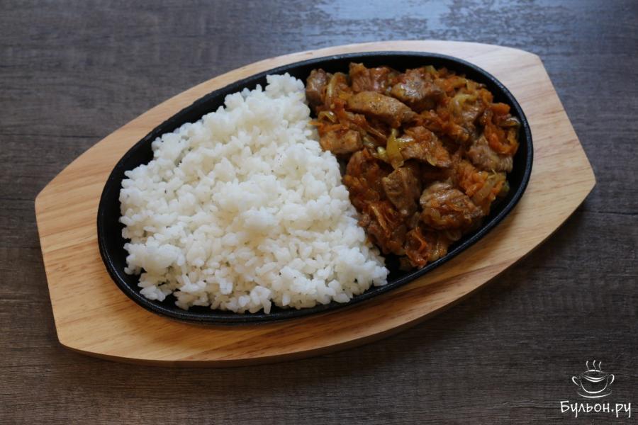 7. Перед тем как снять с плиты мясо, попробуем его на вкус. При необходимости подсолим блюдо, перемешаем и снимем его с огня.