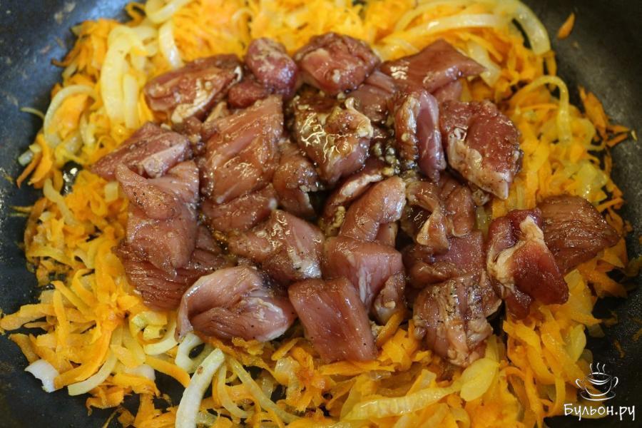 6. После, сразу же, выкладываем кусочки маринованной свинины. Жарим все вместе еще в течение 5 минут, время от времени помешиваем. Вливаем воду, закрываем крышкой мясо с овощами и тушим еще 6 минут.