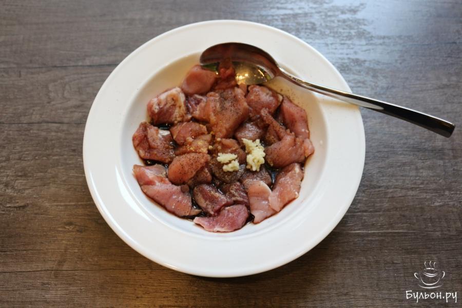 2. Теперь замаринуем мясо. К кусочкам свинины вливаем соевый соус, добавляем имбирь, перец, измельченный через чеснокодавку чеснок, перемешиваем и оставляем на несколько минут.
