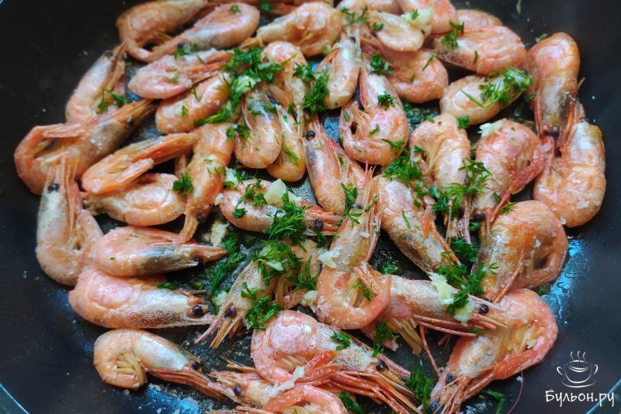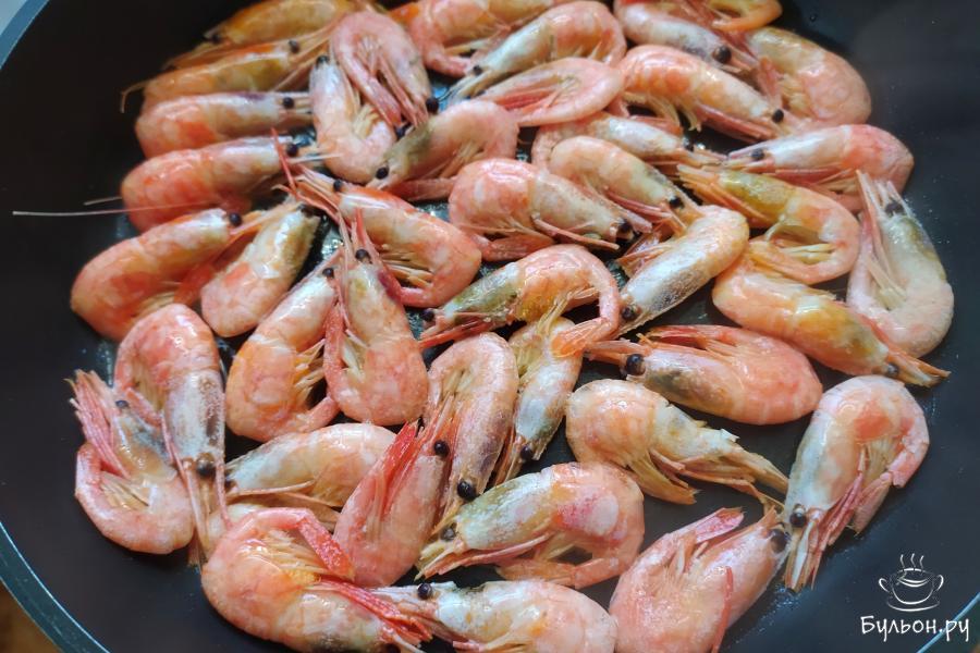 2. В сковородке разогреть 15 г сливочного и 2 ст л подсолнечного масла. Добавить креветки в сковороду. Обжаривать 5 минут, помешивая.