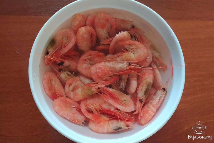 1. 300 грамм замороженных креветок залить водой. Дать им оттаять. Далее откинуть креветки на дуршлаг, дать стечь воде.