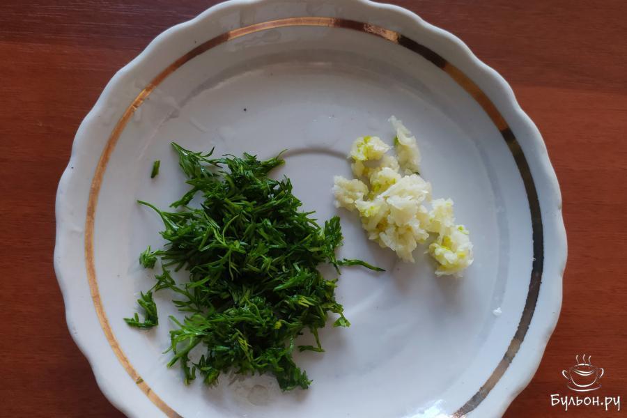 3. Измельчить, с помощью ножа, несколько веточек укропа. Почистить и натереть на мелкой терке 3 зубчика чеснока.