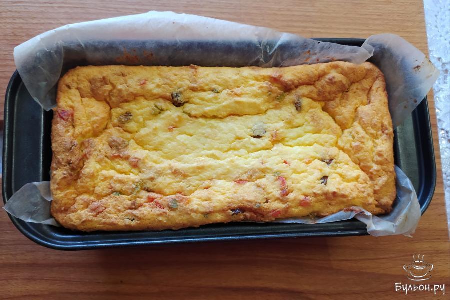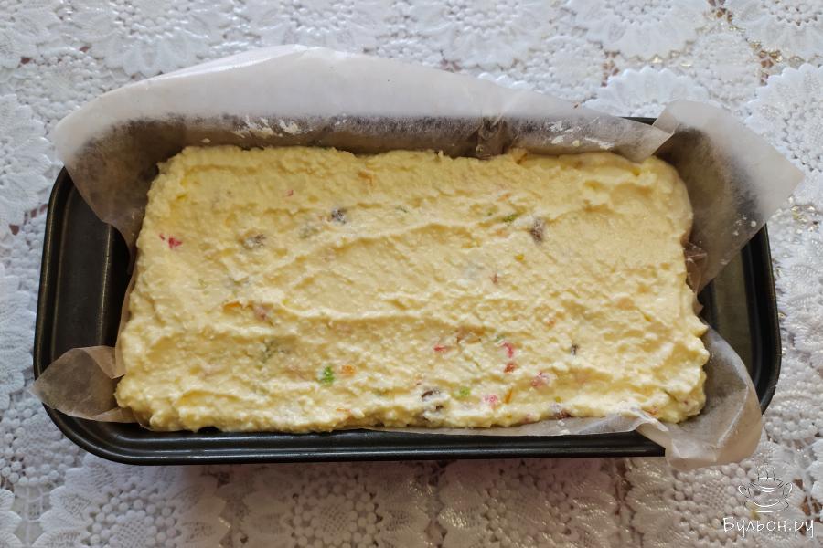 8. Прямоугольную форму застелить пекарской бумагой и выложить в нее будущий сырник. Поставить в духовку, прогретую до 180 градусов.