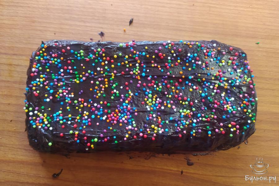 10. Готовый Львовский сырник вынуть из формы, перевернуть на разделочную доску или блюдо, снять пергамент. Покрыть растопленным шоколадом, смешанным с 2 ст. л. воды или молока. Для красоты посыпать посыпкой. Отправить наш сырник в холодильник на ночь, чтобы он настоялся.