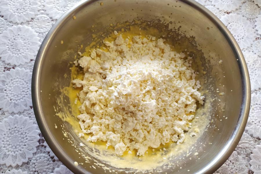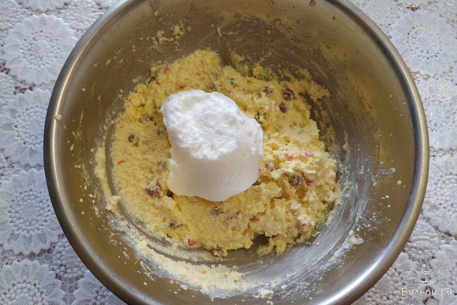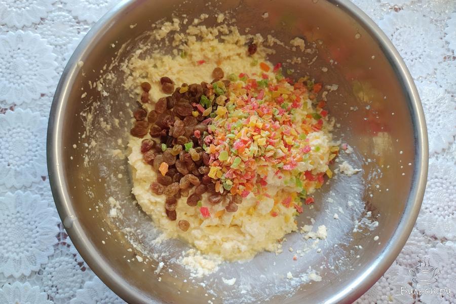 5. Изюм запарить в горячей воде на 15 минут. Затем воду слить, изюм просушить. Цукаты брать мелкие или нарезать мелко ножом. Перемешать изюм и цукаты с творожной массой. Оставить на 10-15 минут постоять, чтобы манная крупа разбухла.