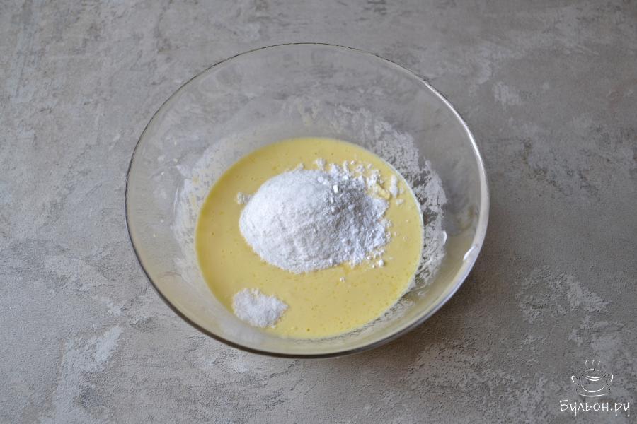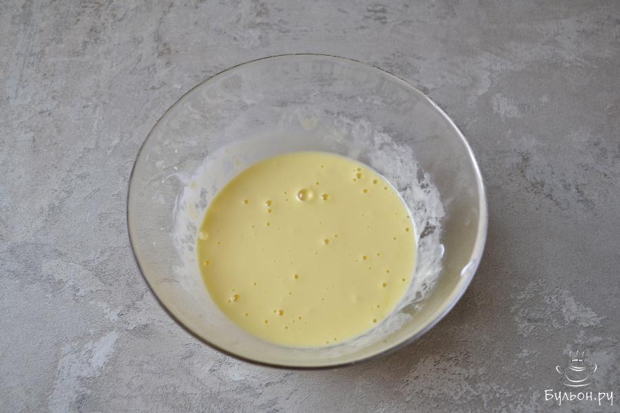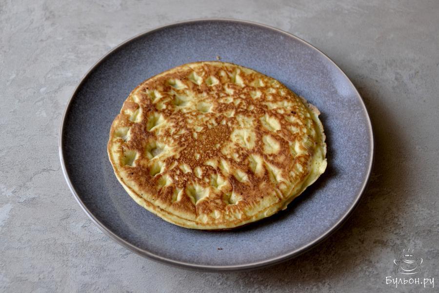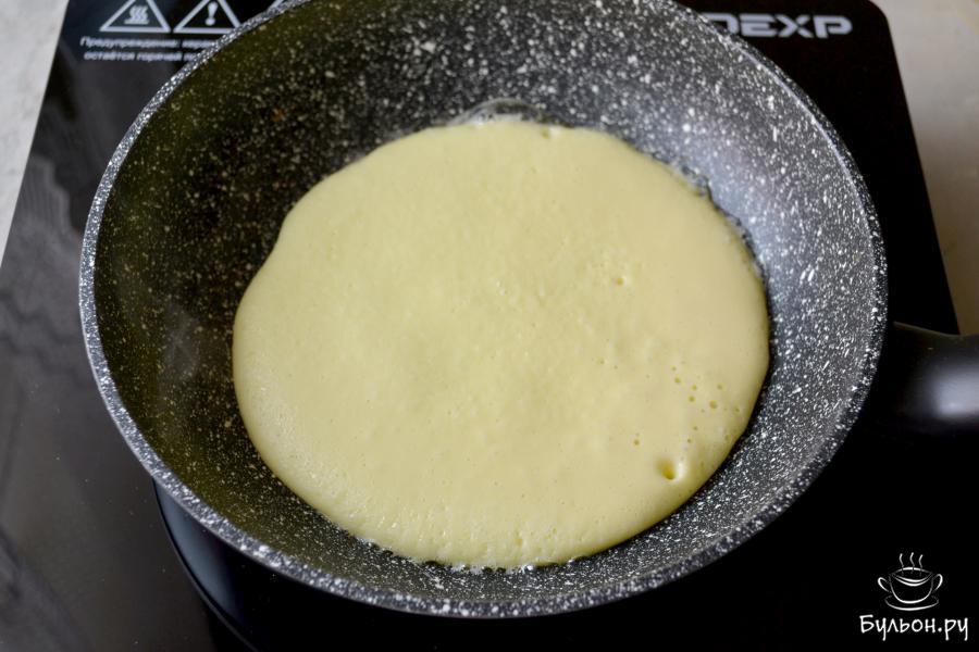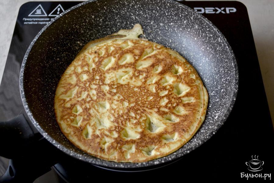 4. Разогрейте сковороду с маслом и вылейте 1/3 теста. Перед тем, как наливать тесто на сковороду, обязательно перемешайте тесто, так как, рисовая мука оседает на дно. Жарьте блин на огне, ниже среднего.