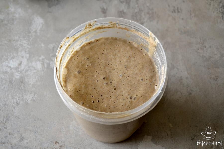 4. В ржаную закваску (150 мл.) влейте теплую воду (100 мл.) и добавьте ржаную муку (2 ст. л). Оставьте ее для подъема. Если закваска качественная, то для ее подъема понадобится примерно 2,5 - 3 часа. На пике подъема закваску можно использовать для выпечки.
