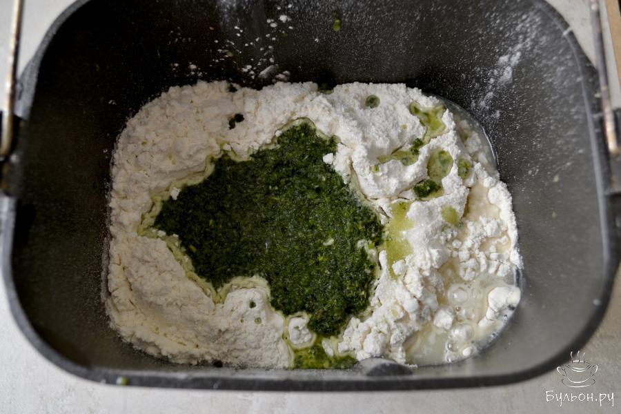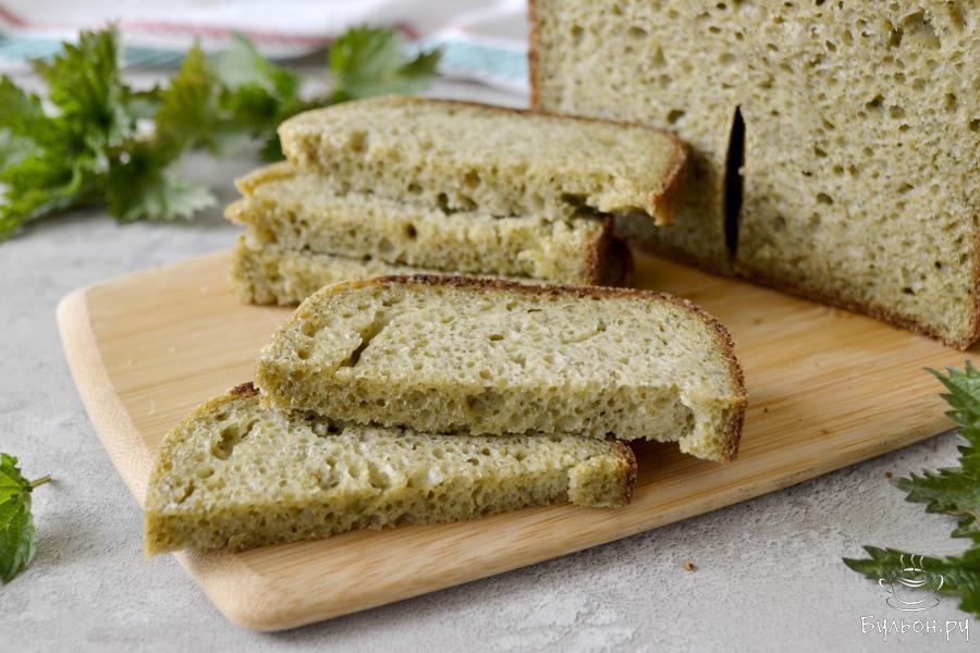 10. Испеченный хлеб вытряхните на решетку и полностью охладите. Остывший хлеб замечательно режется, почти без крошек. В хлебе хорошо ощущается вкус крапивы, цвет хлеба получился светло-зеленый. Вкус хлеба необычный, интересный.