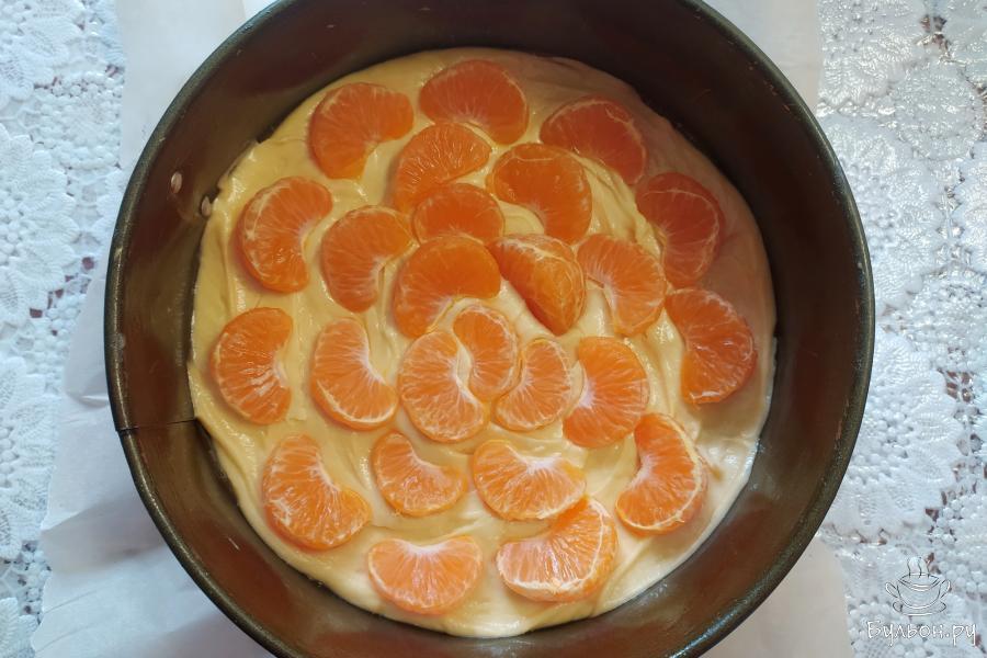 5. Форму 20 см застелить пергаментом, распределить равномерно половину теста. Выложить дольки мандарин.